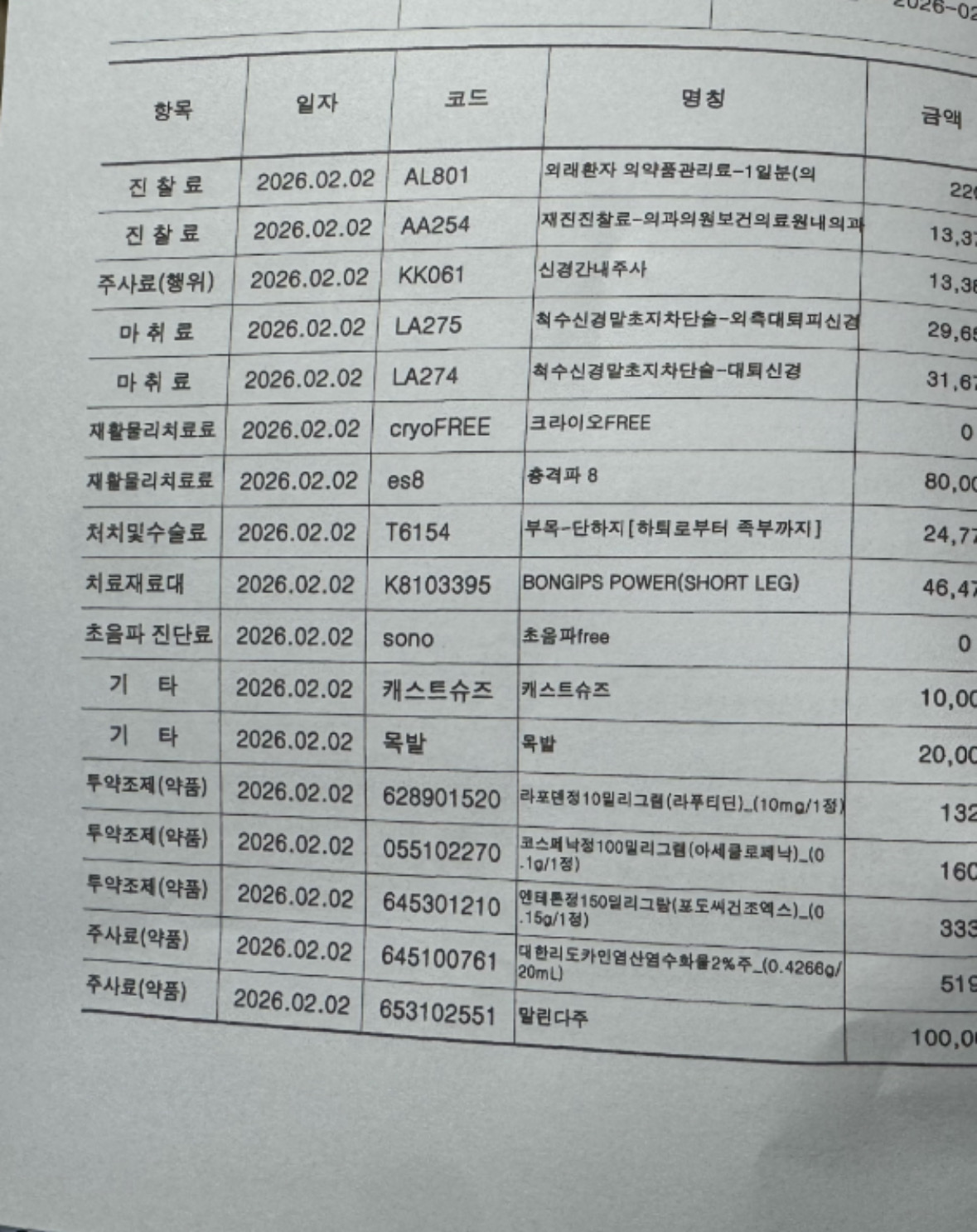 처음에 다치자마자 신경외과병원을 갔습니다(평소 허리때문에 다니고있었거든요..) 병원에서 다음과 같은 주사/시술을 받았습니다.